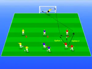 The purpose of this drill is work on combination passes that can lead to a shot on goal